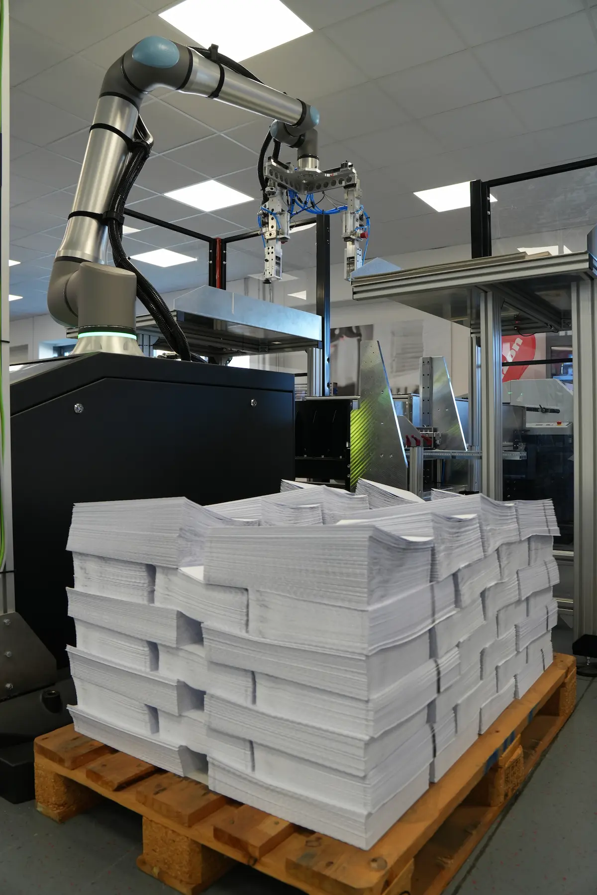 Der Einsatz von Robotik rundete die gezeigten automatisierten Produktionsprozesse ab, um gerade bei wiederholbaren, körperlich schweren Tätigkeiten Entlastung für Maschinenbediener zu schaffen und die Abläufe möglichst effizient zu gestalten. Allen voran: ein neuer Palettierroboter, der in enger Zusammenarbeit mit Unchained Robotics auf die Bedürfnisse von Druckereien abgestimmt wurde. Die von der Falzmaschine AFC-746F gefalzten Signaturen werden schonend mit einem neuentwickelten Greifer aufgenommen und sicher auf der Palette positioniert – bereit zum Transport mittels AGV zum nächsten Verarbeitungsschritt. Die Produkte können flexibel ausgerichtet (lange oder kurze Kante voran) und besonders eng zueinander auf der Palette platziert werden. Die einzelnen Lagen lassen sich durch Zwischenlagen trennen. Durch die modulare Bauweise ist der Roboterarm flexibel hinter sämtlichen Anlagen, egal ob Sammelhefter oder Falzmaschine, einsetzbar.